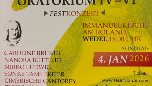 Die Johann-Rist-Gesellschaft feiert ihr 10-jähriges Jubiläum mit der Darbietung des Weihnachtsoratoriums von J.S.Bach, Teile IV-VI, am 4. Januar, 18 Uhr, in der Immanuelkirche unter der Leitung von Matthias Dworzack. Karten sind über das Buchhaus Steyer oder www.reservix.de erhältlich. Weitere Informationen: www.johann-rist.de